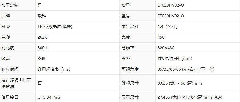 > 1.9寸tft显示屏320x480高清彩屏cpu 34pin小屏幕
