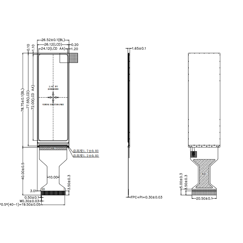 外观尺寸: 26.52W) x 78.75(H) x1.65(T) mm