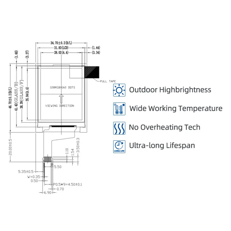 ET018QE02-SD(128×160,并行数据,1000 尼特,-20 至 70 摄氏度,34.7×46.7 毫米)