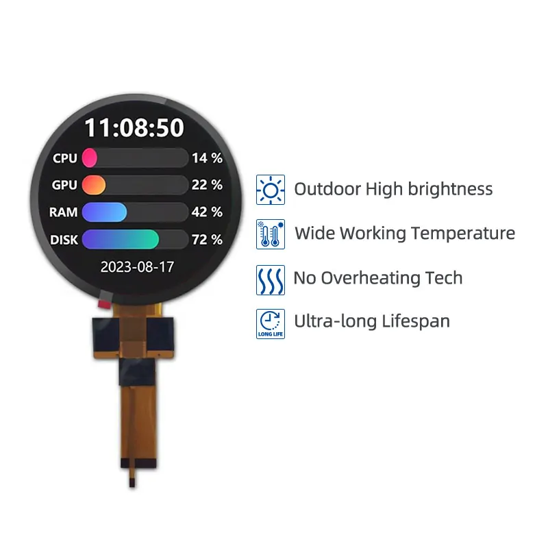 > 4.2寸圆形液晶屏720×720分辨率TTL接口 850cd/m²高亮工业级-30~85°C 宽温智能中控旋钮屏