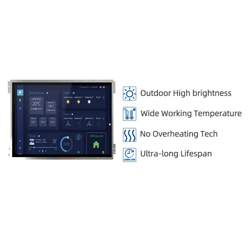 10.4英寸TFT-LCD透射式液晶模组,分辨率1024×768,LVDS工业信号接口,高亮1200cd/m²强光可视,全视角80°显示。超宽温设计-30~80°C工作与存储同范围,工业级可靠性。适用于车载显示、工业自动化、户外设备、船舶导航、安防监控等极端温度与高亮环境场景。